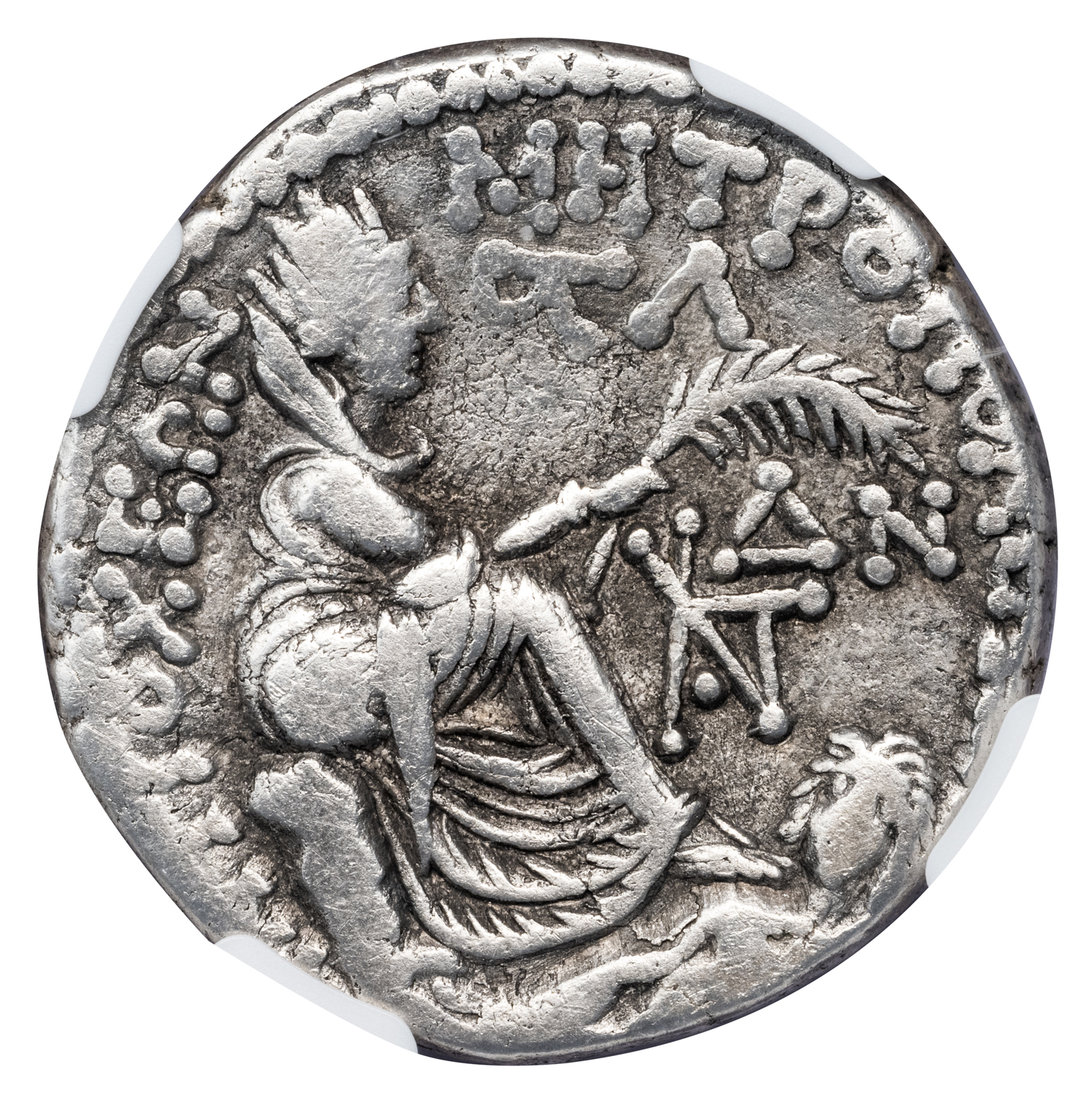 This issue, struck in Actian Era year 36 (AD 5/6), reflects the reassertion of Antiochene civic identity on the tetradrachms struck for Augustus. Whereas the surrounding reverse legend previously provided only the date of issue according to the Actian Era, it now names the Antiochenes as the issuing authority and advertises the status of Antioch as the Syrian mother city. It also drops the former use of numerals in the right field to indicate the emperor’s consulships and replaces them with dates calculated according to the city’s era of autonomy inaugurated when Julius Caesar visited Antioch on 16 April 47 BC.