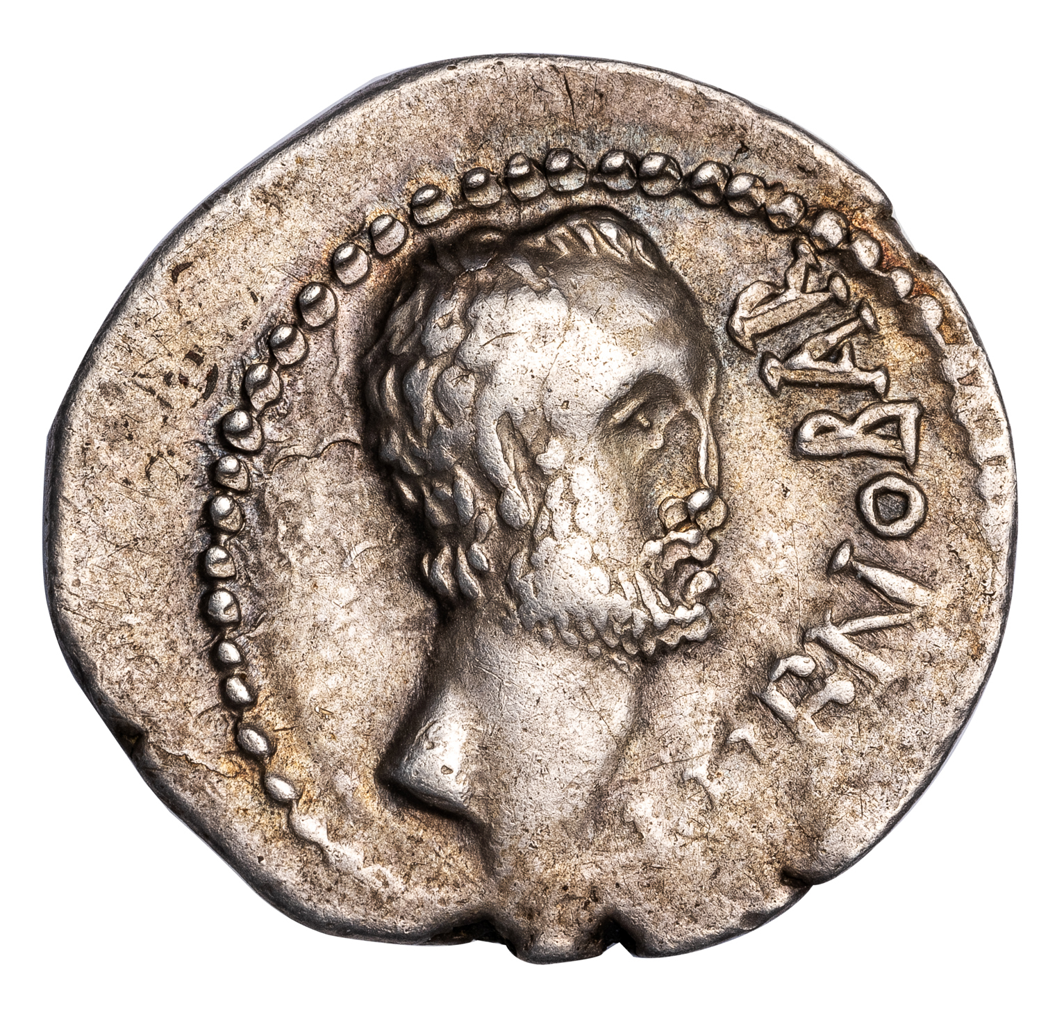 Cnaeus Domitius Ahenobarbus was from a distinguished Roman political family. He may have been among the conspirators who murdered Julius Caesar, but that is not clear. After the murder he fought alongside Brutus, commanding a sizable naval contingent with which he won a great naval victory against the Second Triumvirate in 42 BC.