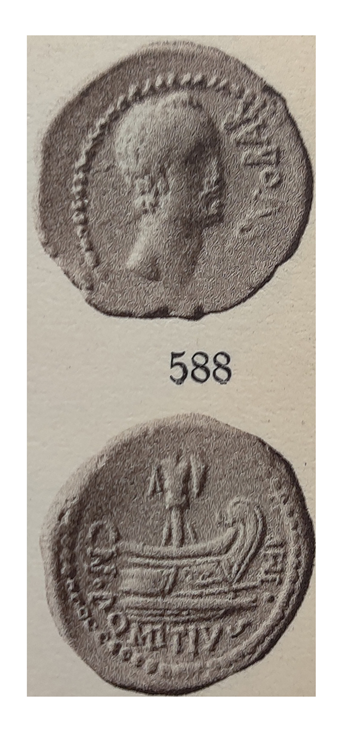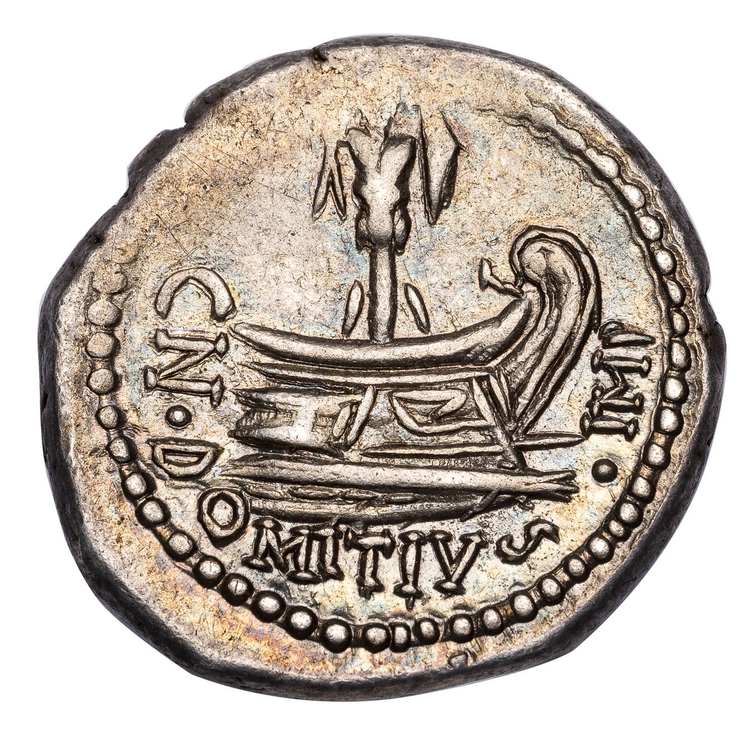 Obv. AHENOBAR, head of Ahenobarbus with short beard right. Rev. CN DOMITIVS IMP, trophy on ship’s prow right.