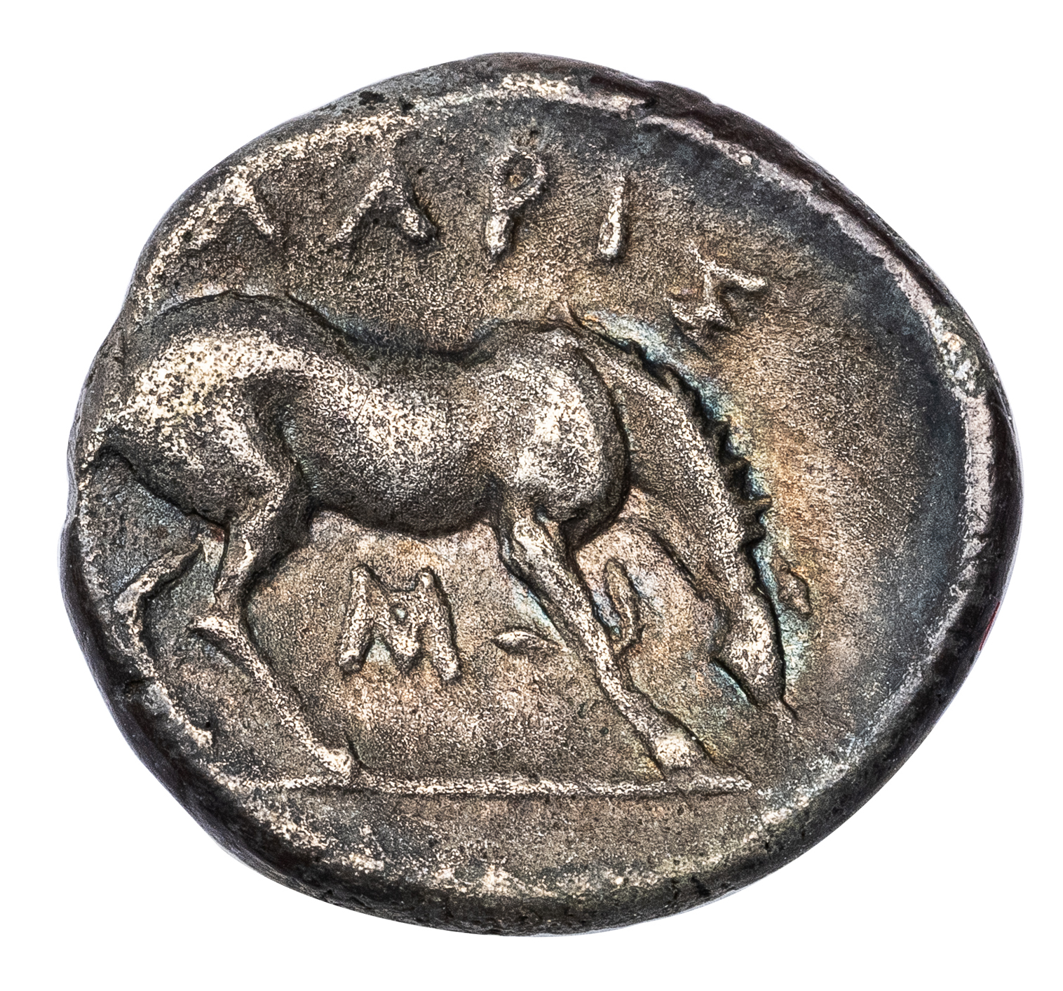 Obv. Head of the nymph Larissa, facing slightly left. Rev. ΛΑΡΙΣ, horse right, preparing to lie down, M control monogram below.