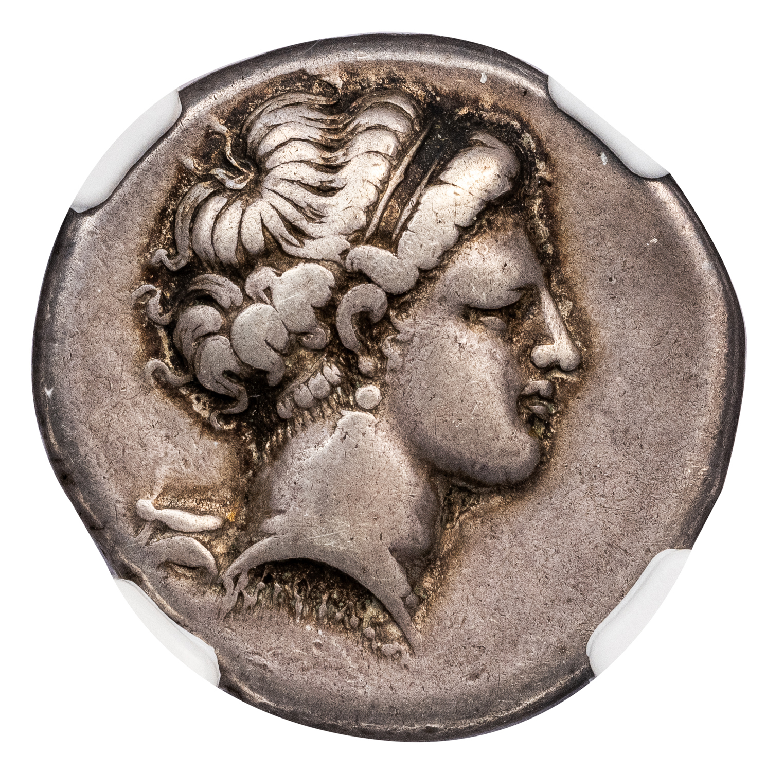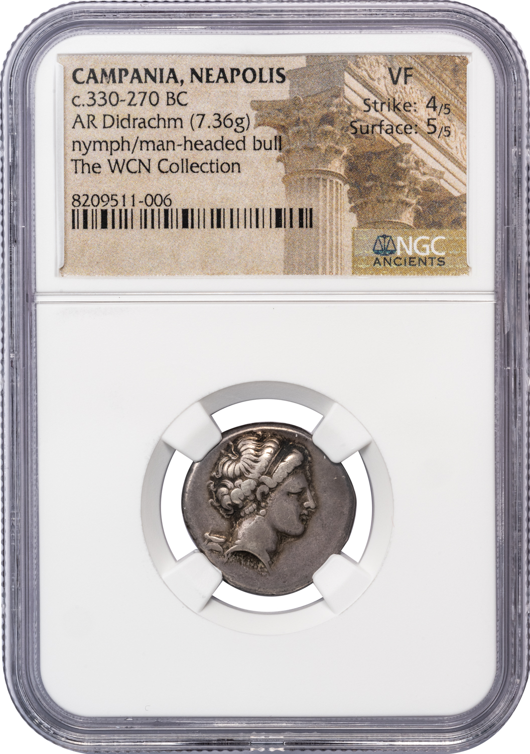 NEAPOLIS SILVER DIDRACHM – MAN-HEADED BULL TYPE OF MAGISTRATE XAPIΛE – VF NGC GRADED GREEK CAMPANIA COIN (Inv. 19782)