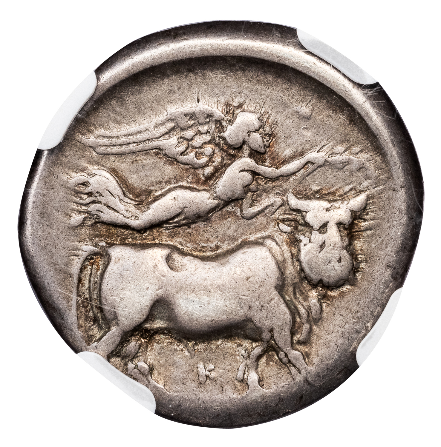 Obv. Head of nymph right, hair gathered with a taenia, XAPIΛE below neck truncation, astragalus in left field. Rev. [NEAΠΟΛΙΤΩN], man–headed bull right, head facing, crowned by Nike flying right above, K below.
