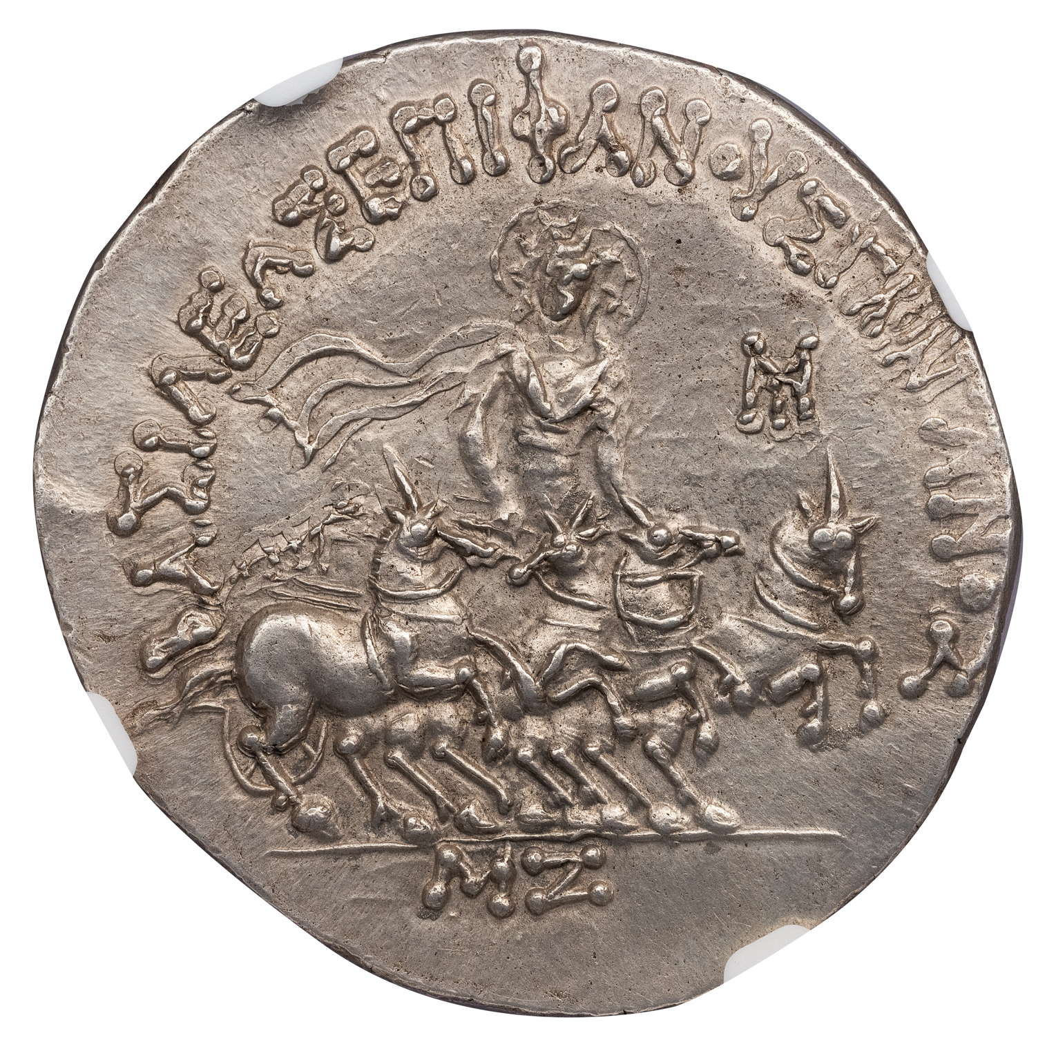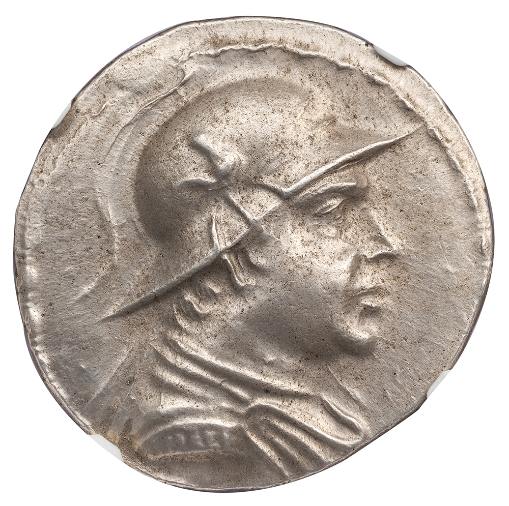 Obv. Diademed, draped and cuirassed bust of Plato right, wearing helmet with bull’s horn and ear. Rev. EΠIΦANOYE ΠΛATΩNOΣ, Helios, facing, standing in quadriga with galloping horses to right, MY control monogram in right field, MZ (date) in exergue.