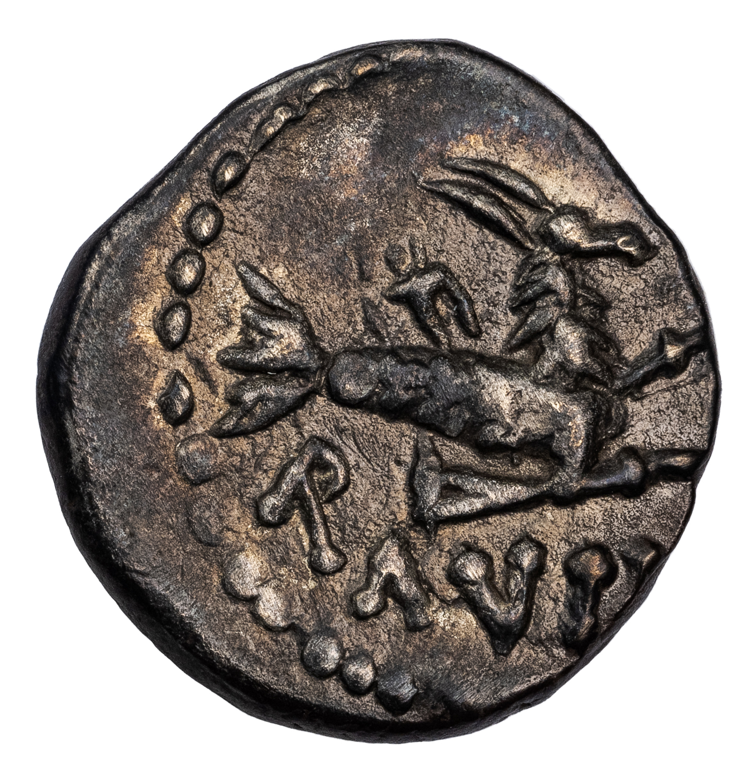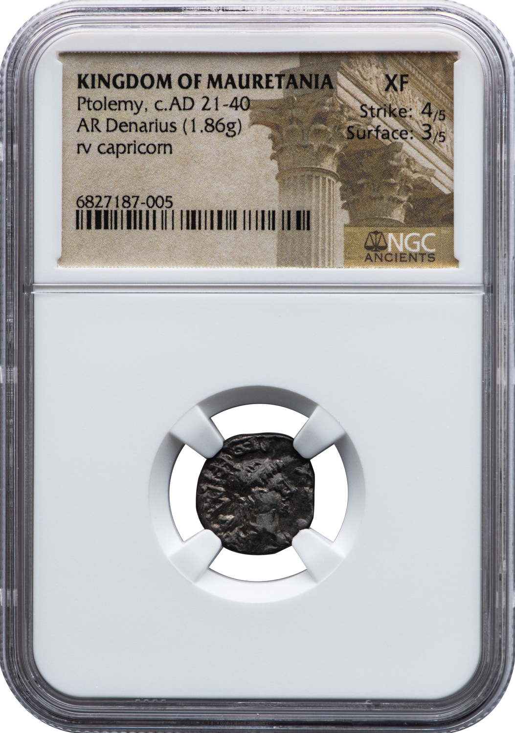 PTOLEMY OF MAURETANIA SILVER DENARIUS – CAPRICORN ISSUE OF GRANDSON OF CLEOPATRA VII – XF NGC GRADED MAURETANIAN KINGDOM COIN (Inv. 18899)