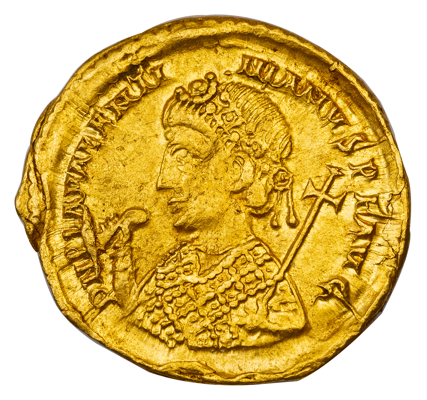 Valentinian III was the son of Constantius III and the famous Galla Placidia. With the help of his uncle Theodosius II, Valentinian ascended the throne at 6 years of age with his mother as regent. This coin was part of an issue celebrating the emperor’s “decennalia,” the anniversary of 10 years of rule, when he was 16.