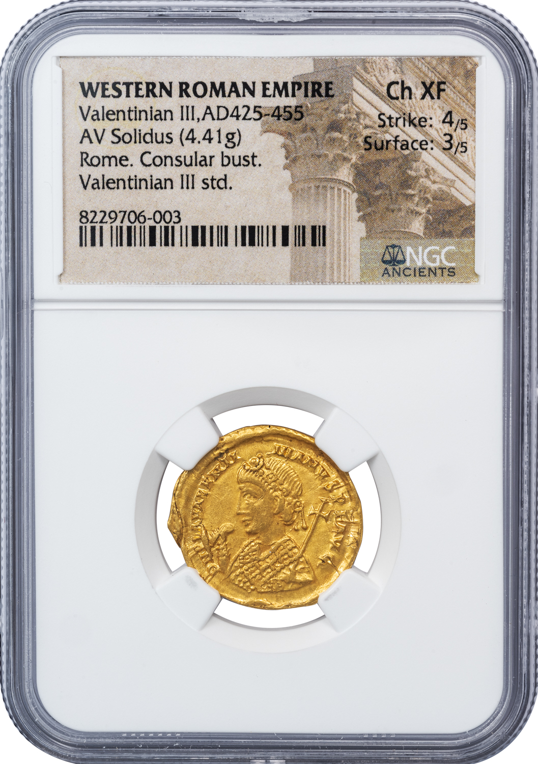 VALENTINIAN III GOLD SOLIDUS – DECENNALIA ISSUE OF ROME – CHOICE XF NGC GRADED ROMAN IMPERIAL COIN OF THE WESTERN EMPIRE (Inv. 19761)